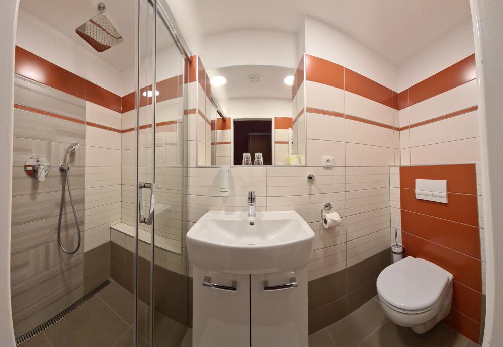 The newly renovated Delux double room has two separate beds and up to two comfortable extra beds, a bathroom with a shower and toilet. It includes a television and a tea and coffee making set. WiFi connection is provided in the room. The room has a view of the ski jumping hills.