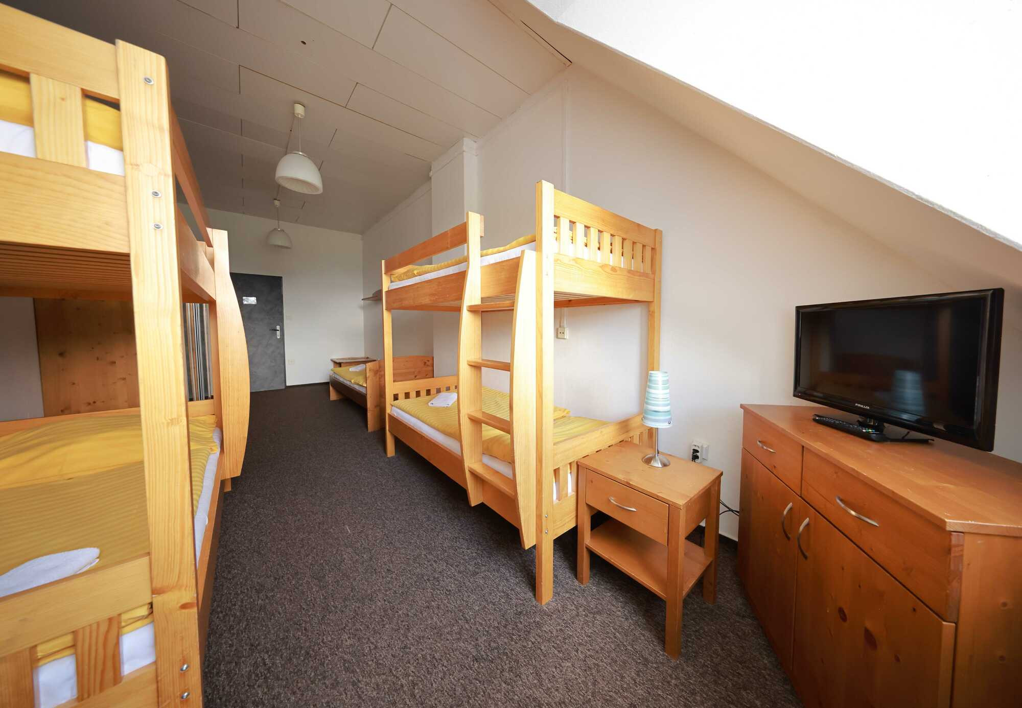 Prosto urządzony pokój 5-osobowy z 2 łóżkami piętrowymi i 1 łóżkiem pojedynczym. Toalety są wspólne na korytarzu.
